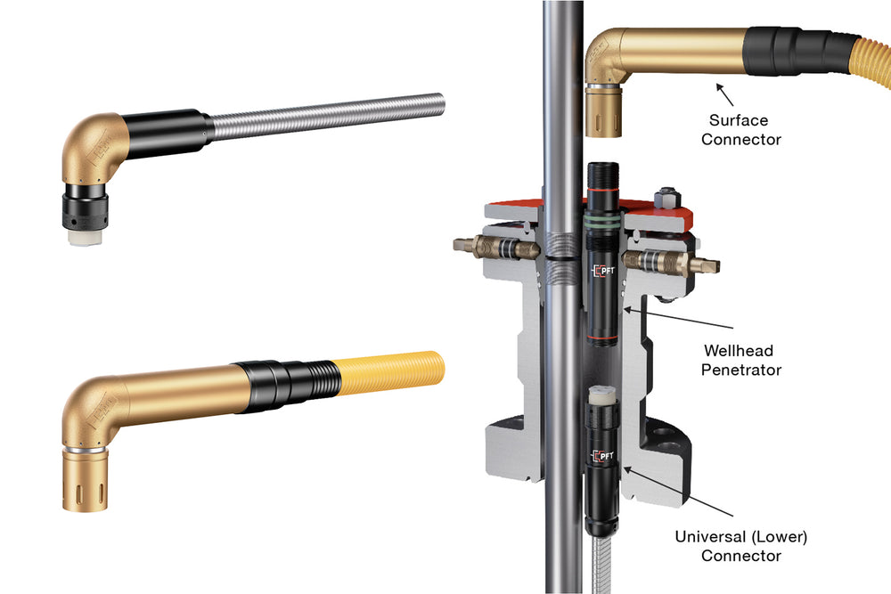 We offer the Oil & Gas sector a line of advanced technology PFT (Power Feed-Thru Systems) electrical connectors, designed to optimize the performance of ESP systems in demanding conditions, including wells with high pressure, high temperatures, complex completion configurations and C1D1 classified environments.