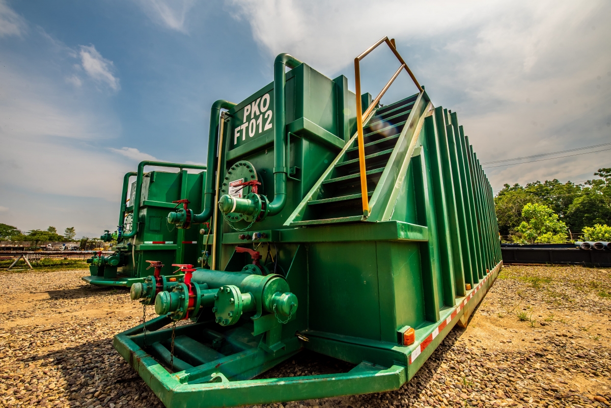 Los Frac Tanks son Tanques diseñados para el almacenamiento de fluidos en pozo, permitiendo la facilidad de transporte a cualquier destino, además, viene diseñado con diferentes formas de descarga tanto atrás como adelante, logrando flexibilidad para mayor comodidad en el trabajo en pozo. Viene equipado con barandas móviles para su montaje después de ubicado el equipo. Totalmente recubierto con pintura epóxica en su interior, permitiendo mejorar su vida útil y conservación del fluido en su interior. Cuenta con escaleras de acceso fácil tanto en la parte superior del tanque con en el interior. Cada uno de los Frac Tanks viene totalmente aforado permitiendo medir con exactitud la cantidad de fluido presente en ella.